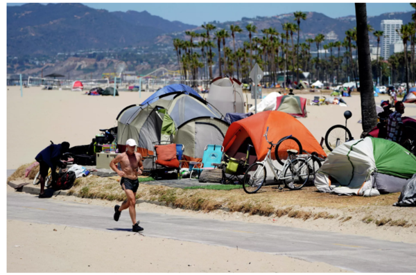 2021년 6월 8일 자 자료사진에서 조깅하는 사람이 로스앤젤레스 베니스 해변에 있는 노숙자 캠프를 지나치고 있다. 2021년 9월 16일 목요일, 캘리포니아 주지사 뉴섬은 가장 인구가 많은 주인 캘리포니아 주가 치솟는 주택 가격, 저렴한 주택 부족, 그리고 해결하기 힘든 무주택 문제로 어려움을 겪고 있는 가운데, 지역 구역 조례를 폐지하는 두 가지 조치를 승인했다. 뉴섬은 거의 250개 도시의 시장들이 독소조항으로 인해 지역 계획과 통제를 약화시킬 것이라고 반대함에도 불구하고 가장 중요한 법안에 서명했다.