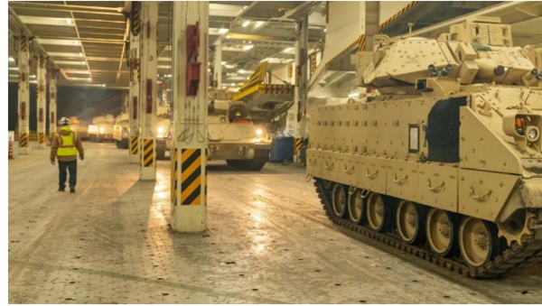2023년 1월 25일 사우스캐롤라이나주 노스 찰스턴에서 미국 수송사령부에 의해 우크라이나에 대한 미국 군사 지원 패키지의 일환으로 브래들리 장갑차들이 선적되고 있다.