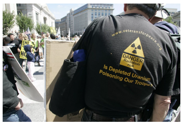 사진: 한 반전 시위자가 2007년 9월 15일 워싱턴에서 열린 이라크전쟁의 종식과 미군의 귀환, 조지 W. 부시 미국 대통령의 탄핵을 요구하기 위해 백악관에서 미국 의사당까지 행진하며 미국 무기에 열화우라늄 사용을 의심하는 티셔츠를 입고 있다.