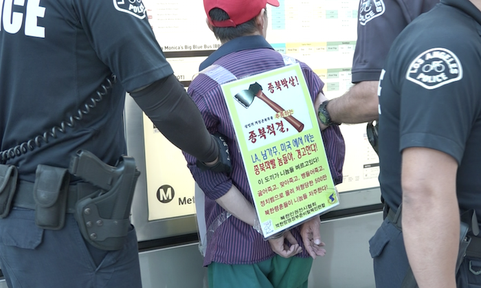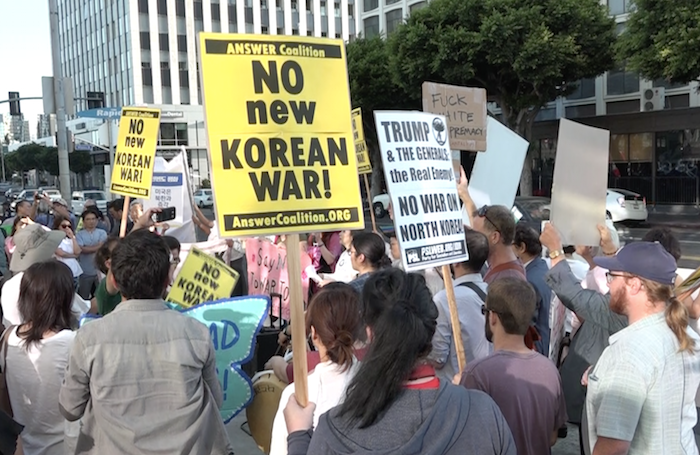[로스엔젤레스=민족통신 공동취재] 트럼프 행정부의 한반도 전쟁책동에 반대하는 규탄시위가 로스앤젤레스 도심 한인타운 중심가에서 8월14일에 열렸다.