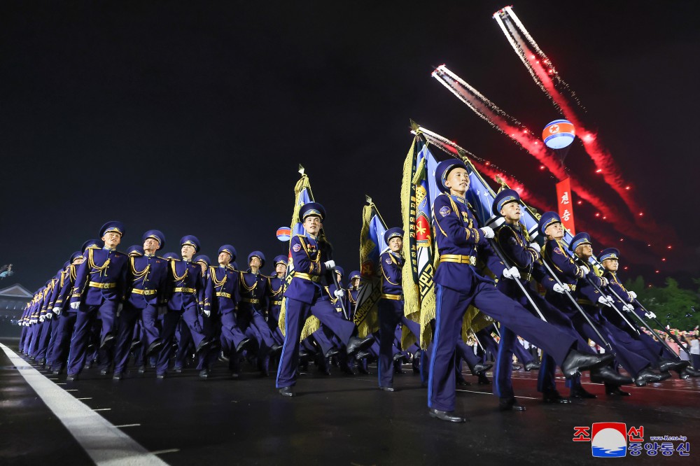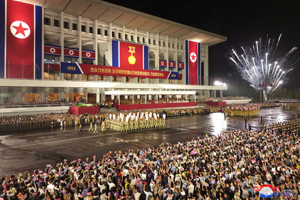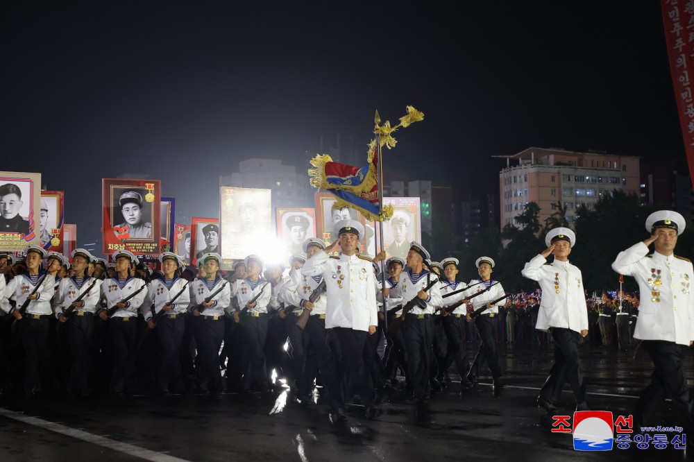 세기와 세대를 이어 우리 국가의 영광넘친 승리의 명절을 맞고 보내는 우리 인민특유의 자부심과 승리전통의 계승성을 과시하며 위대한 전승 71돐경축 조국해방전쟁시기상징종대들의 기념행진의식이 7월 27일 저녁 수도 평양에서 거행되였다.