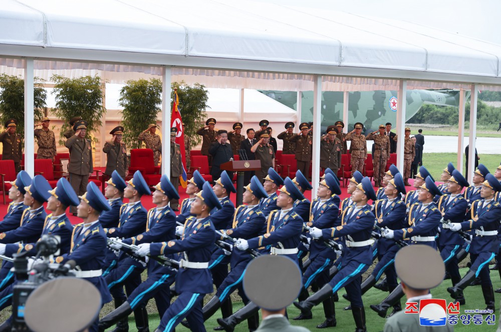경애하는 김정은동지께서 도착하시자 위대한 령장께 드리는 공군장병들의 최대의 경의와 영광이 폭풍같은 《만세!》의 환호성으로 터져올랐다.