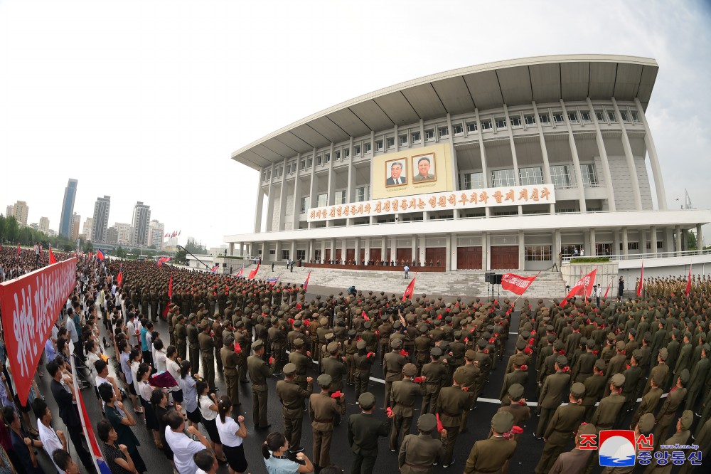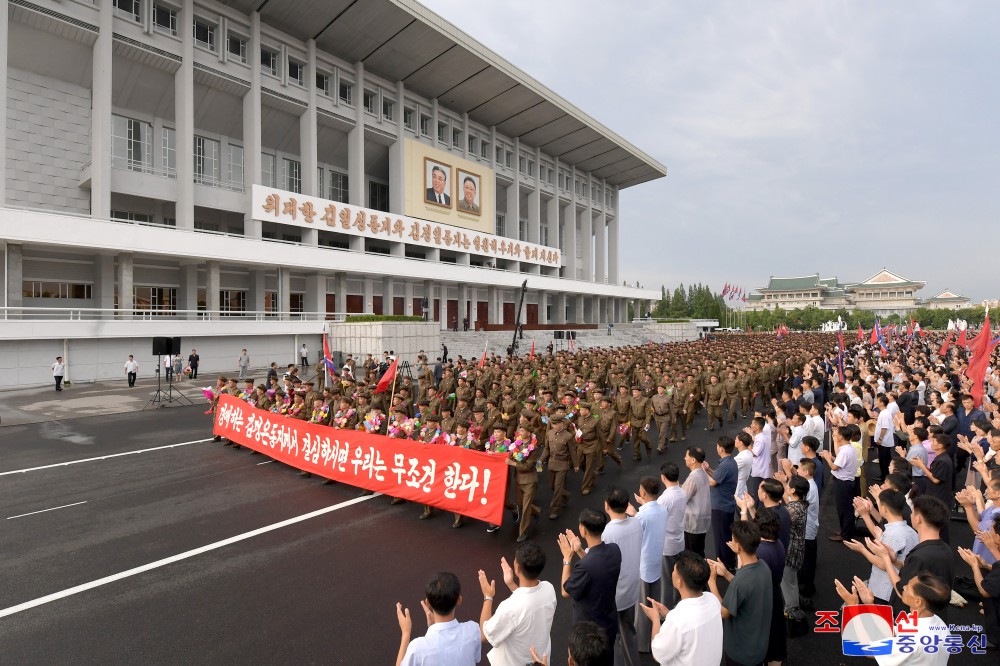 당중앙의 숭고한 인민관이 어린 기폭을 받아안고 터쳐올리는 전투원들의 열광의 박수소리가 진감하고 성스러운 우리의 국기와 붉은기들이 펄펄 휘날리는 광장은 청사에 특기할 기적을 창조하며 광명한 미래를 앞당겨나가는 위대한 우리 당의 과감한 실천력을 다시한번 힘있게 과시해나갈 수도당원들의 억세인 신념과 의지의 분출로 더욱 가열되였다.