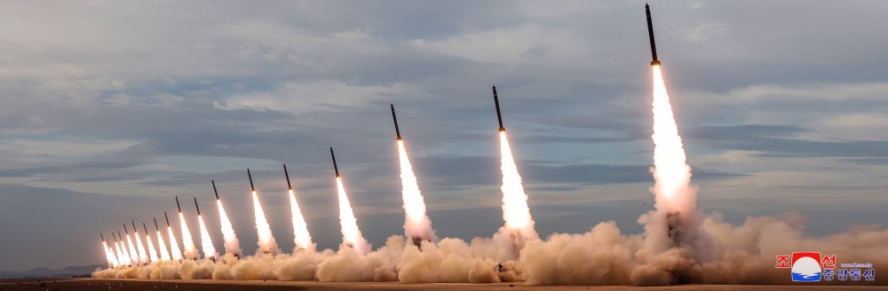 우리 국가의 당당한 주권적권리행사에 위험천만한 무력시위라는 서뿌른 대응판을 벌려놓으며 결코 좌시할수 없는 극악무도한 국권침해도발행위를 감행한 대한민국 깡패정권과 괴뢰군대를 정조준하여 강력하고도 압도적인 전쟁수단으로 국가의 주권과 안전을 보장하고 적들이 공화국을 반대하는 군사력사용을 기도할 때에는 언제든 자위권을 발동하여 선제공격도 불사할 우리의 대응의지를 명백히 보여주기 위한 초대형방사포병구분대들의 위력시위사격이 진행되였다.
