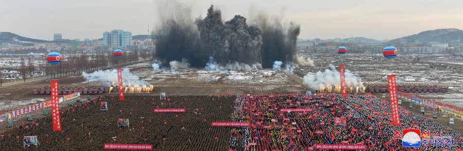 경애하는 김정은동지께서 화성지구 3단계 1만세대 살림집건설의 착수를 알리는 발파단추를 몸소 누르시였다.