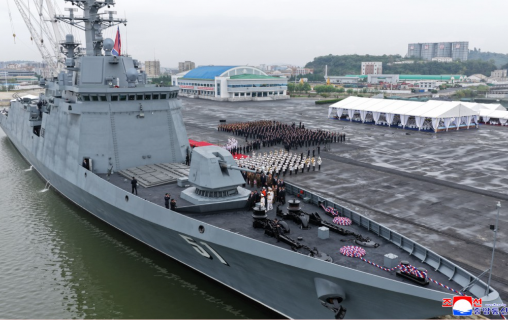 경애하는 김정은동지께서 무장장비전시회 《국방발전-2025》 2일 참관일정에 따라 개막식참가자들과 함께 구축함 《최현》호를 돌아보시였다