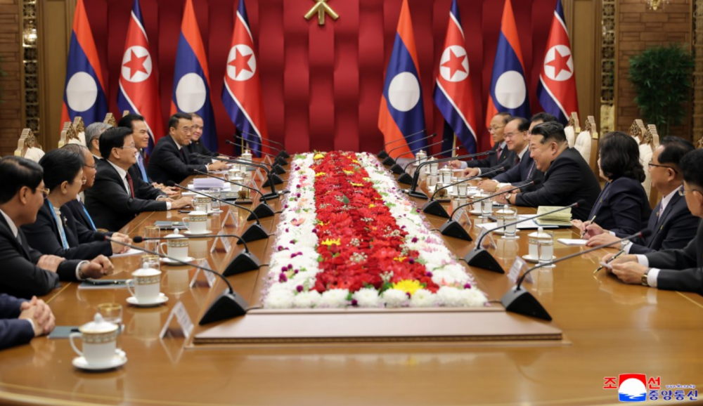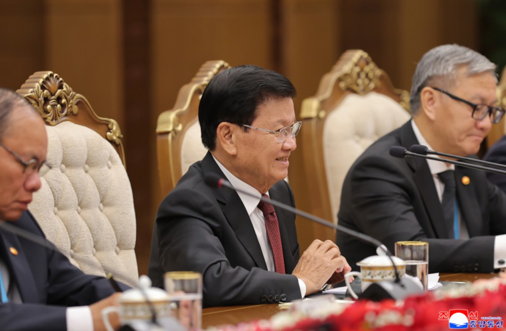 경애하는 김정은동지께서 라오스인민혁명당 중앙위원회총비서,라오스인민민주주의공화국 주석 통룬 씨쑤릿동지와 회담하시였다