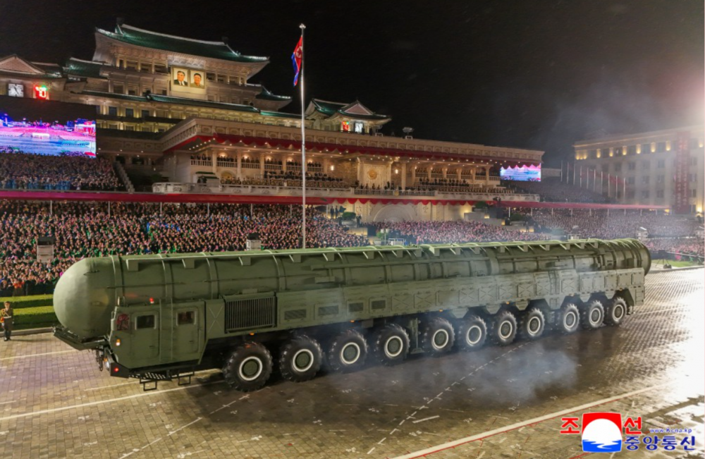 조선민주주의인민공화국의 최강의 핵전략무기체계인 대륙간탄도미싸일 《화성포-20》형종대가 주로를 메우며 광장에 들어서자 관중들이 터치는 열광의 환호는 고조를 이루었다.