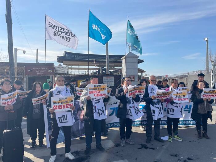 삭발식을 마친 이들은 미군기지 측에 미국에 항의하는 내용을 담은 공개서한을 전하려 했다. 그러나 미군기지 측과 경찰이 가로막았다.