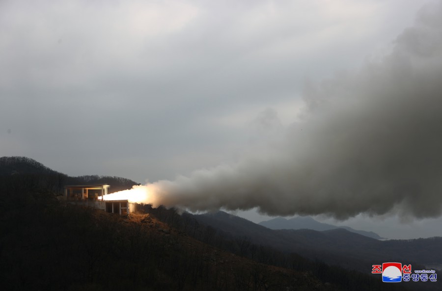 국가방위력 강화의 줄기찬 발전행로 우에 경이적인 과학기술적 성과들이 다발적으로 탄생하고 있는 시대에 또 다른 전략적 <가치>를 가지는 신형 중. 장거리 극 초음속미사일용 고체연료 발동기 지상분출 시험이 성공적으로 진행되였다. 조선민주주의인민공화국 미사일 총국과 산하 발동기연구소는 3월 19일 오전과 오후 서해 위성발사장에서 신형무기체계 개발일정에 따라 중, 장거리급 극초음속 미사일에 장착할 다계단 고체연료 발동기 지상분출시험을 진행하였다.